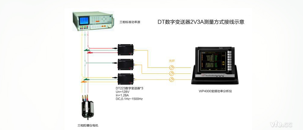 本次測試采用湖南銀河電氣有限公司研制的WP4000變頻功率分析儀,該分析儀是目前國家變頻電量測量儀器計量站的測量基準(zhǔn),測試數(shù)據(jù)具有較高的精度和最高的權(quán)威性。 根據(jù)被測電機(jī)的電壓和電流,WP4000 的功率單元選擇 DT223B(128V/1.28A)數(shù)字變送器。每個DT 數(shù)字變送器可連接一路電壓和一路功率。 由于電機(jī)未引出中性線,一般采用二瓦計法測量三相功率,為了更加準(zhǔn)確直接的反映三相電流,每相電流均采用一個DT數(shù)字變送器進(jìn)行測量。