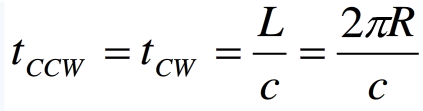 如圖(a)所示,在無旋轉(zhuǎn)條件下,兩束光傳輸時間相等為